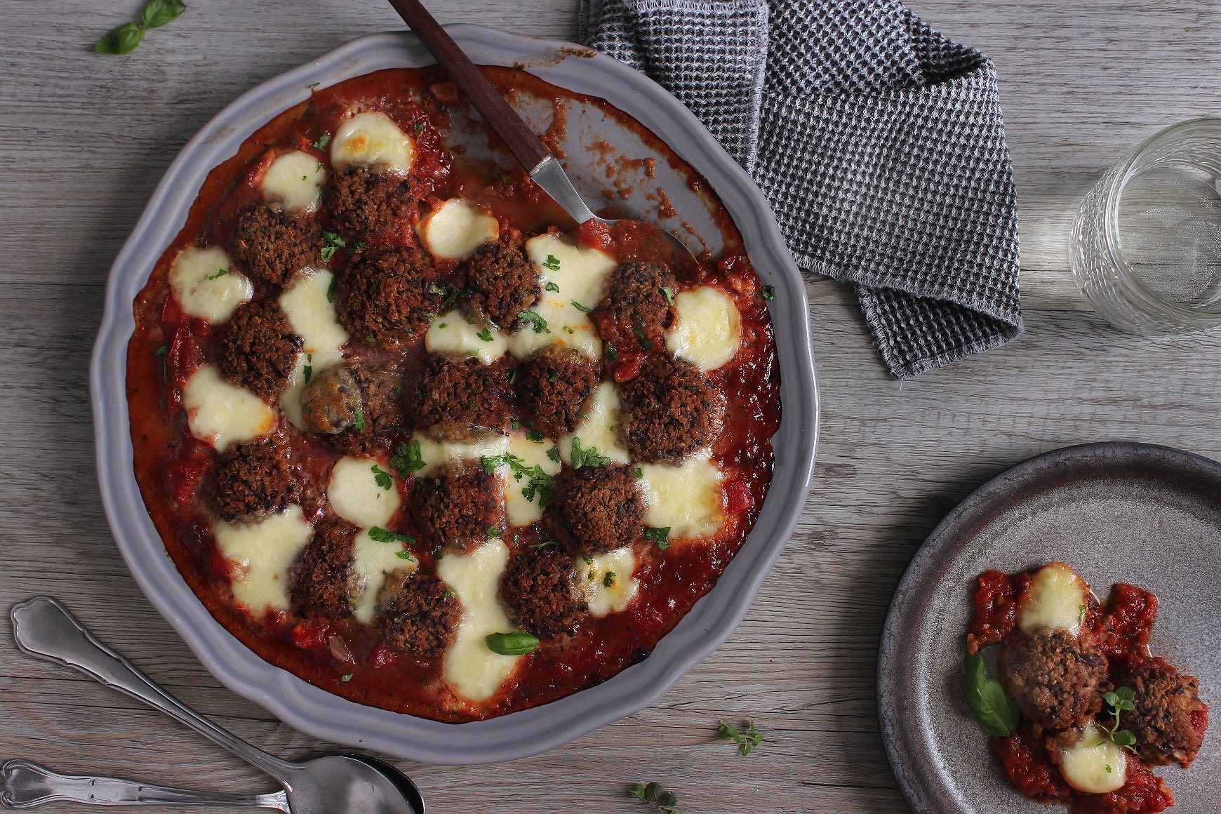 - Die Tomatensoße in eine ofenfeste Form umfüllen. Die gebackenen Schwarze Bohnen-Bällchen aus dem Ofen holen und in die Tomatensoße setzen. Mini-Mozzarella darauf verteilen und alles für 10-15 Minuten im Ofen überbacken lassen.